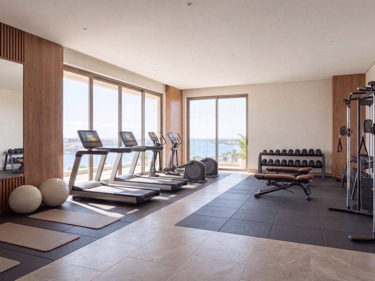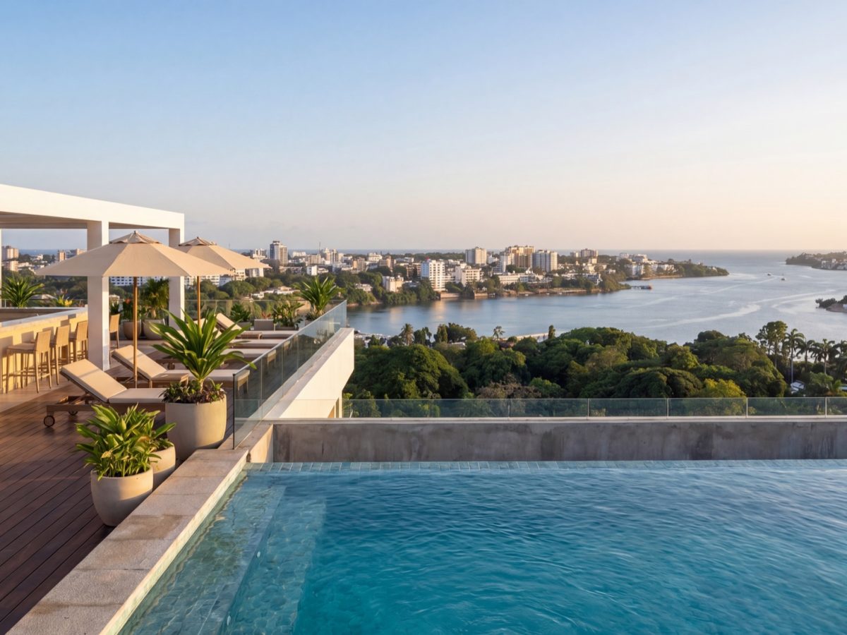 Ground level is a retail boulevard with a residents’ restaurant and ground-floor café. The wellness floor pairs a gym, yoga studio, sauna and spa. The rooftop is a private pool and lounge, terraced for views across the creek to Nyali and back to the city.